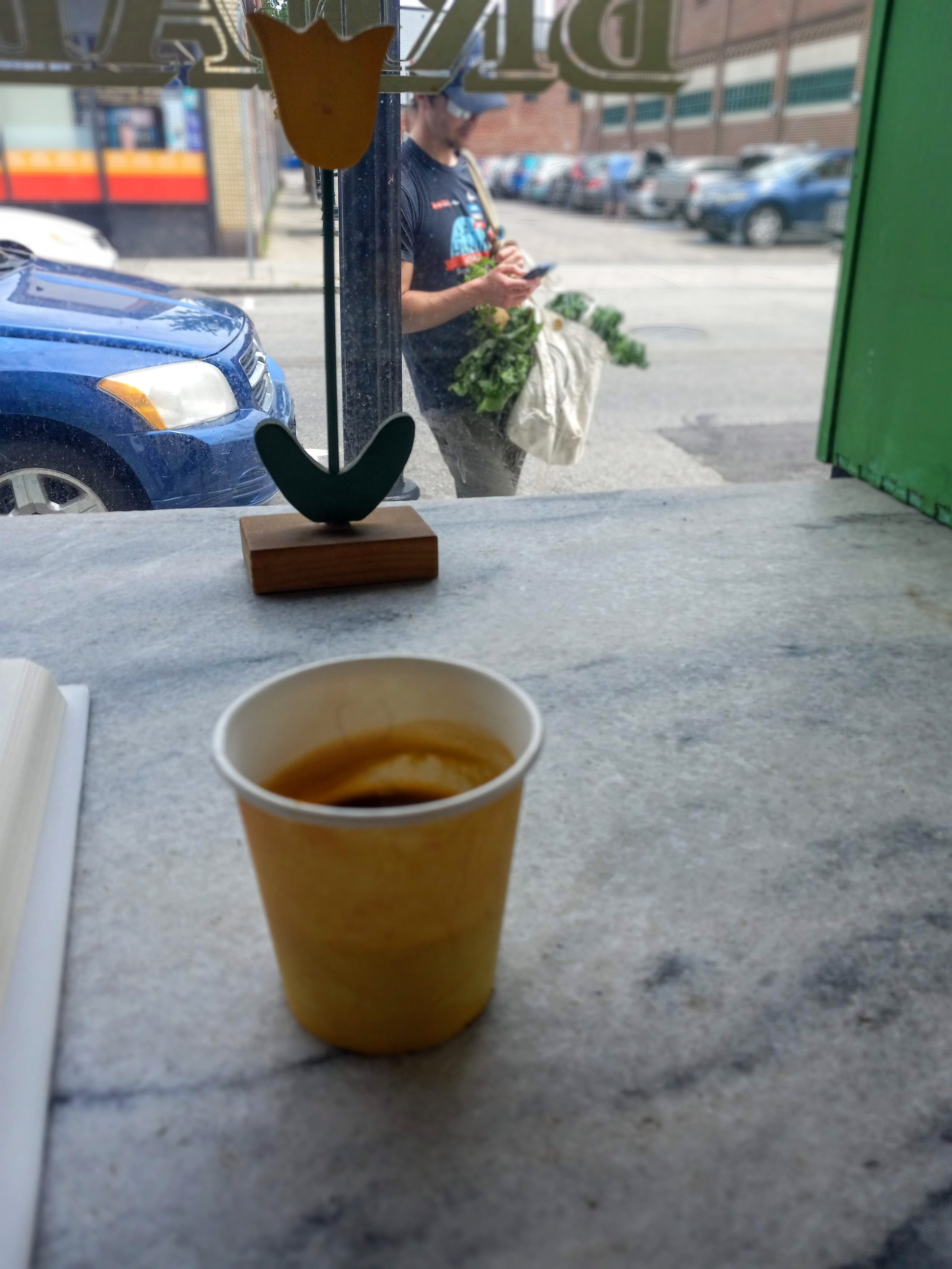 Caught a glimpse of someone’s greens just overflowing from their farm market bag, while a wooden tulip decoration was in view:
