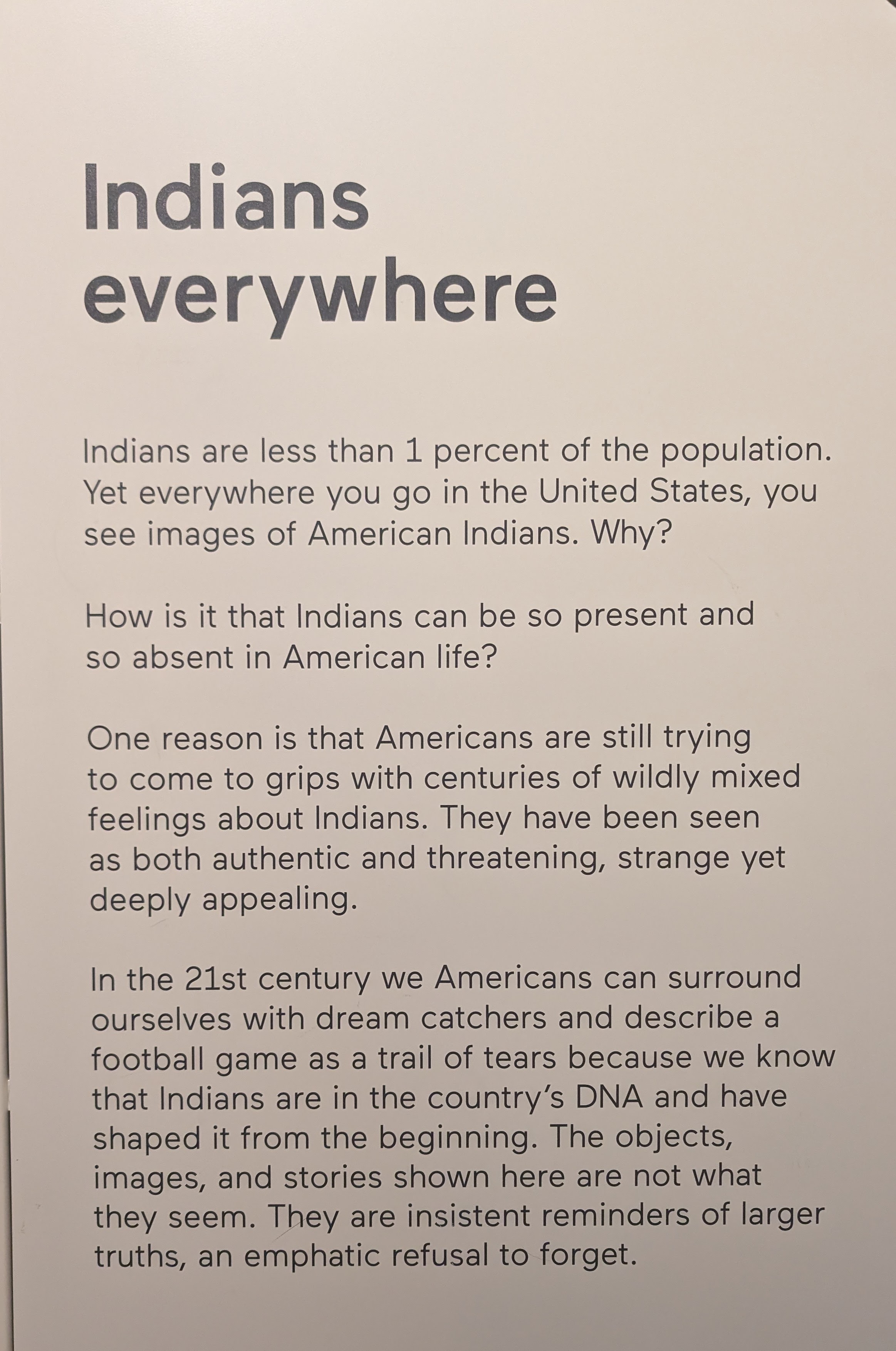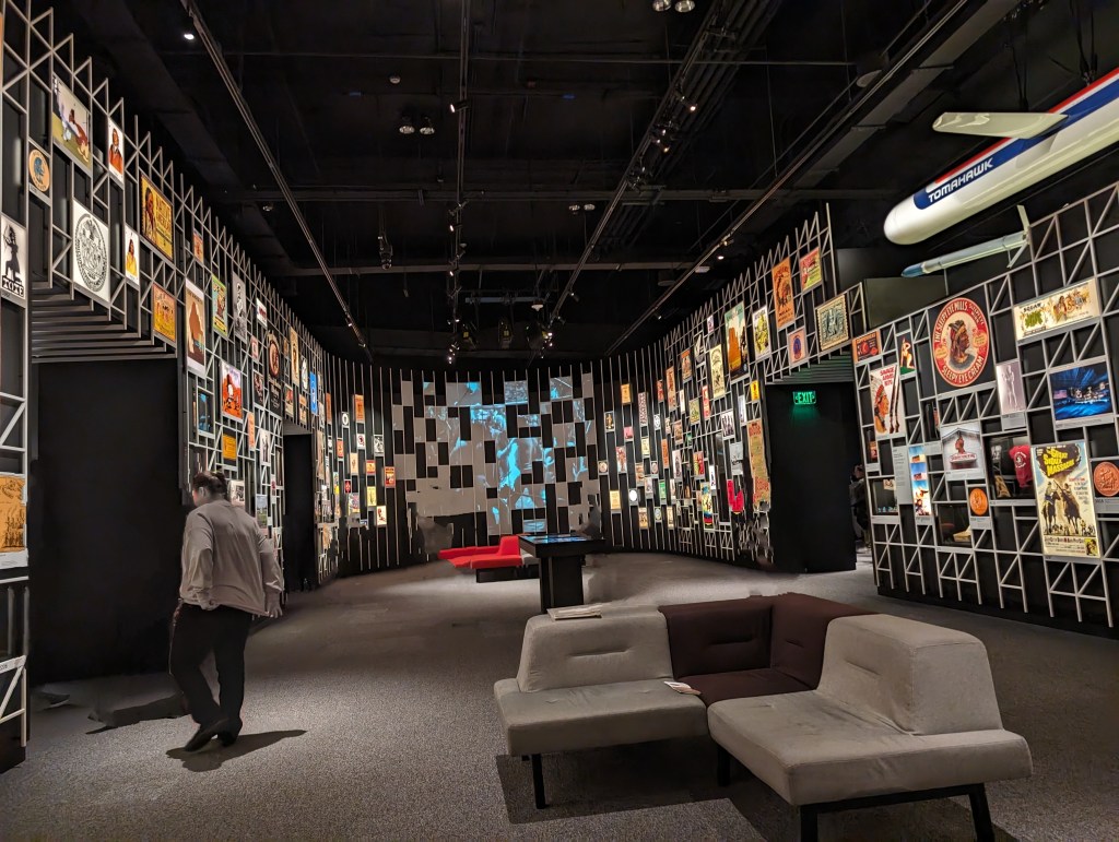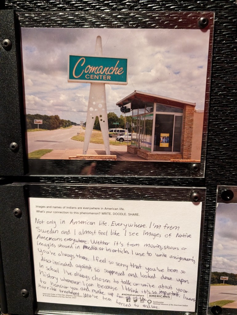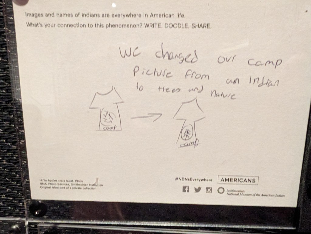 The above exhibit in the museum painstakingly curated examples of Native peoples represented (accurately or not) across American culture: from sports mascots to brand images to music, movies, TV, and more.